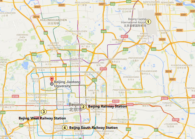 Airport Bus: Take airport bus (Gongzhufen line) to Beijing Friendship Hotel station (¥16). Walk to the Sitongqiao east bus station, take the bus No. 26 to Daliushu station (¥2), then go to the west gate of Beijing Jiaotong University on foot.